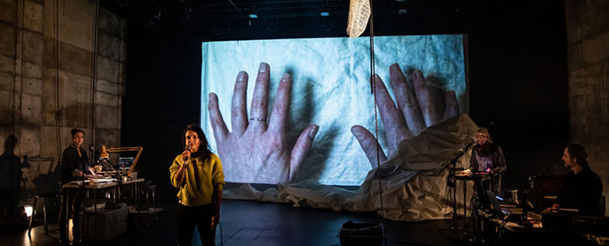 À la manière d’une performance poétique live, les artistes sur scène tissent délicatement le récit de ce voyage par les actions plastiques, la musique, le chant, les images cinématographiques et des bribes de souvenirs personnels.