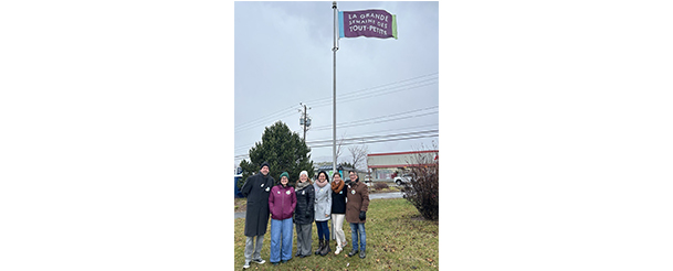 Photo : Levée du drapeau avec Pascal Alain, directeur loisir, culture et vie communautaire; Marie Christine Leblanc, coordonnatrice Maison de la Famille Avignon; Karine Pelland, directrice générale CPE -BC Aux Joyeux Marmots; Édith Bernatchez, agente de communication et de soutien, Complice Persévérance scolaire Gaspésie-Les Îles; Laurie Gallagher, coordonnatrice loisir, sport et plein air; Régis Leblanc, conseiller municipal.