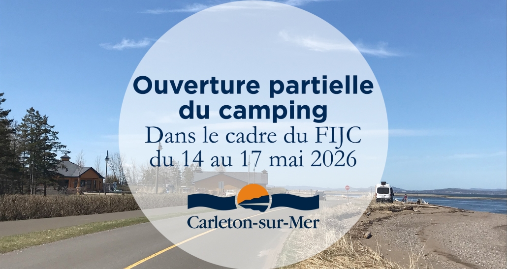 Dans le cadre du Festival international du journalisme, la Ville de Carleton-sur-Mer est heureuse d’annoncer un projet pilote pour 2026, soit l’ouverture partielle du camping pour la durée de l’événement, du 14 au 17 mai.