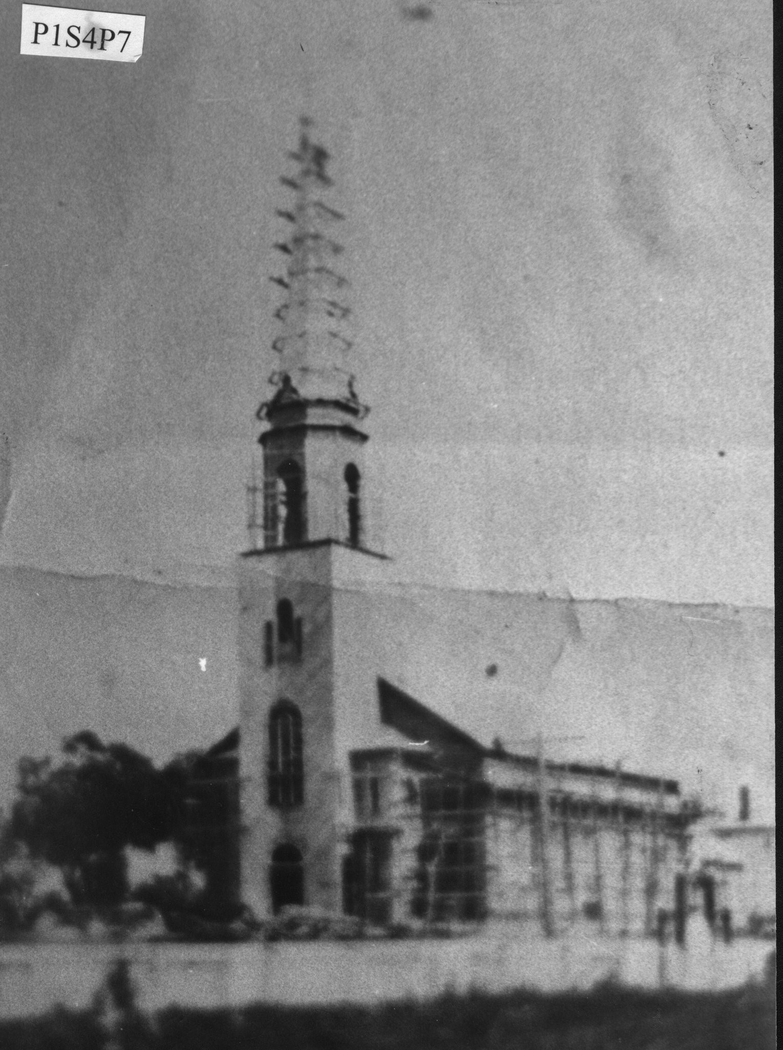 En 1917, l’église Saint-Joseph se harnache d’échafauds destinés à des travaux de réfection majeurs. Photo : Écomusée Tracadièche.